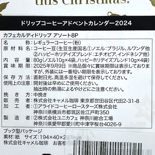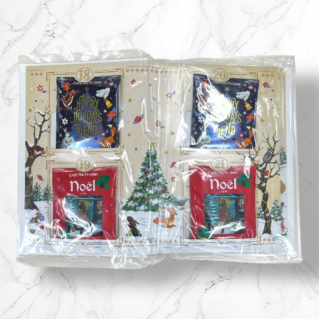 2種のドリップコーヒーをセットした、ブック型のアドベントカレンダーです。ダークチョコレートのような風味とビターな味わいの「ノエル」と、シトラスピールのような爽やかな風味の「ハッピーホリデイズブレンド」がそれぞれ4個ずつ計8個入っています。