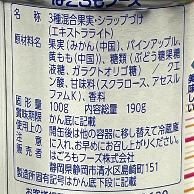 みかん、パインアップル、黄桃が入っています。ガラクトオリゴ糖入り。フルーツのおいしさを引き立てるちょうど良い甘さのシラップは目覚めからの「頭の立ち上げ」に必要なぶどう糖を供給