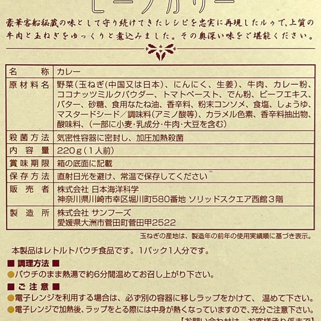 豪華客船秘蔵の味として守り続けてきたレシピを忠実に再現したルゥで、上質の牛肉と玉ねぎをゆっくりと煮込みました。その奥深い味をご堪能ください。