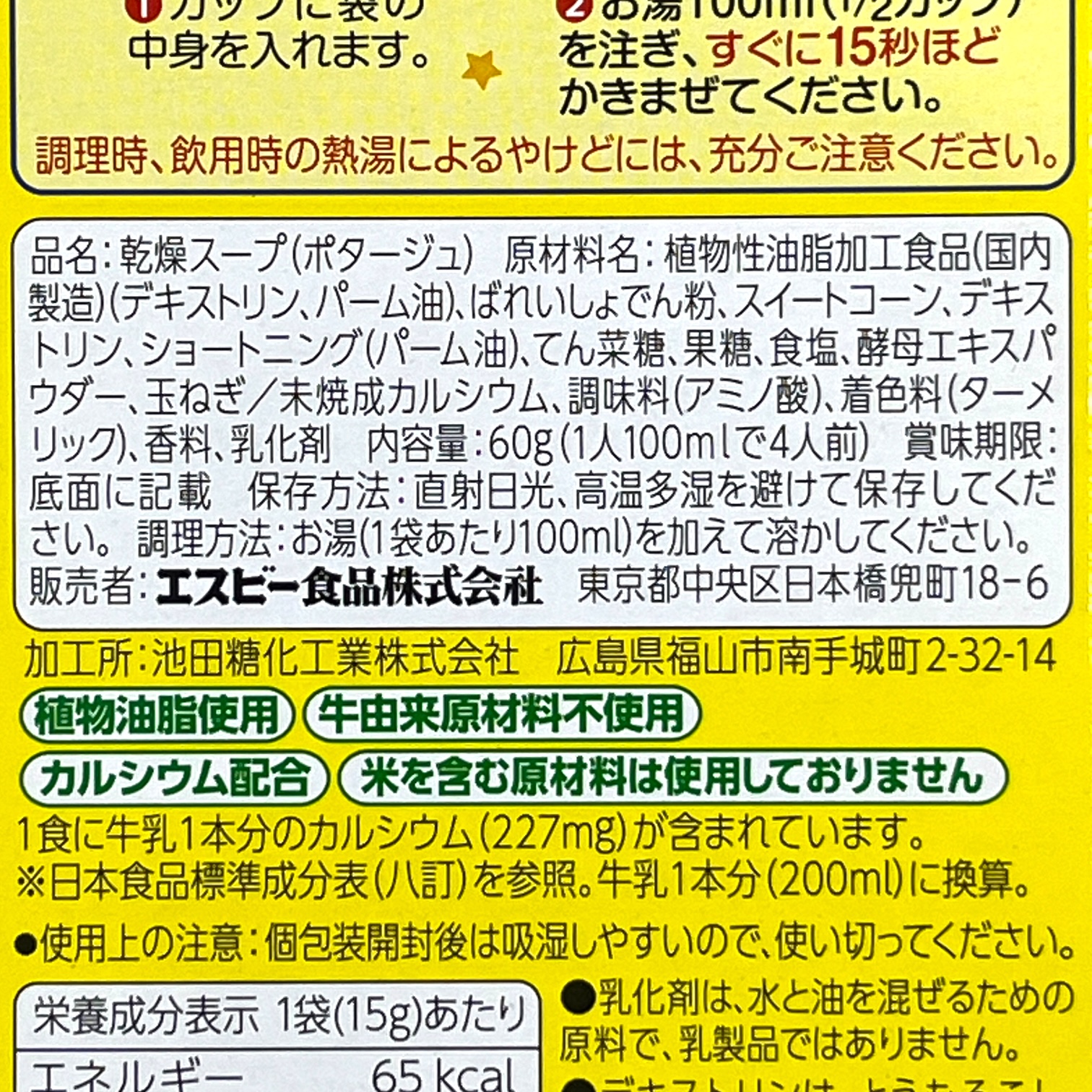 北海道産のスイートコーンを使用し、優しい味わいとコクが特徴のコーンポタージュスープです。1食に牛乳1本分のカルシウム入り。(アレルギー特定原材料等28品目不使用)