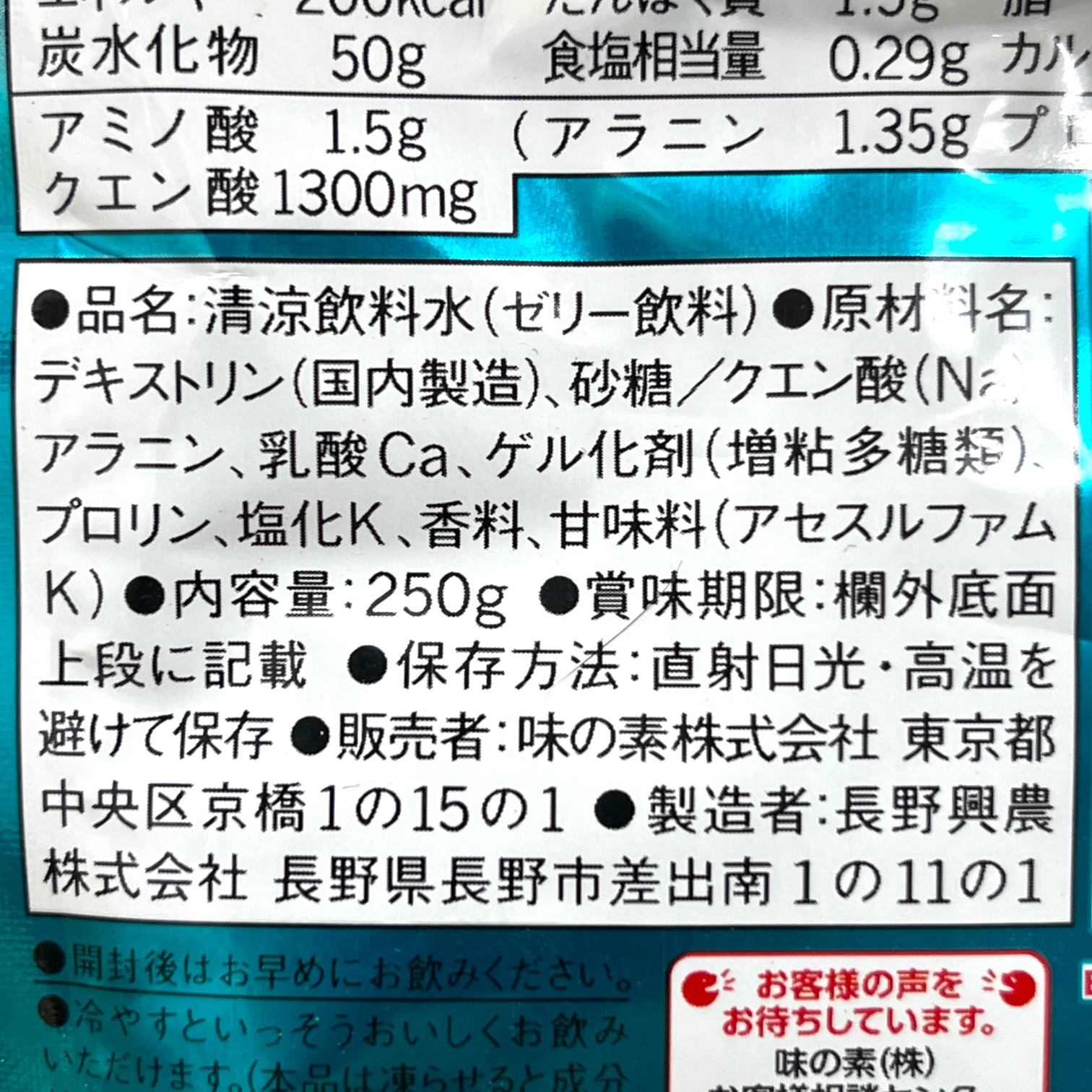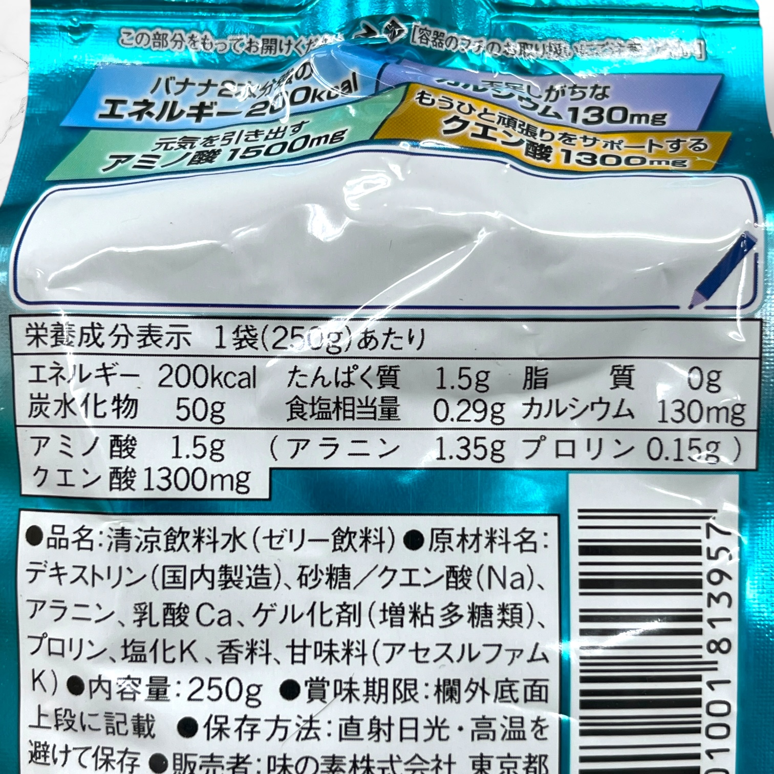 エネルギー源となるアミノ酸1500mgとカラダづくりに大切なカルシウム130mg、ひと頑張りをサポートするクエン酸1300mgを配合したゼリーです。1袋でバナナ2本分強のエネルギー。