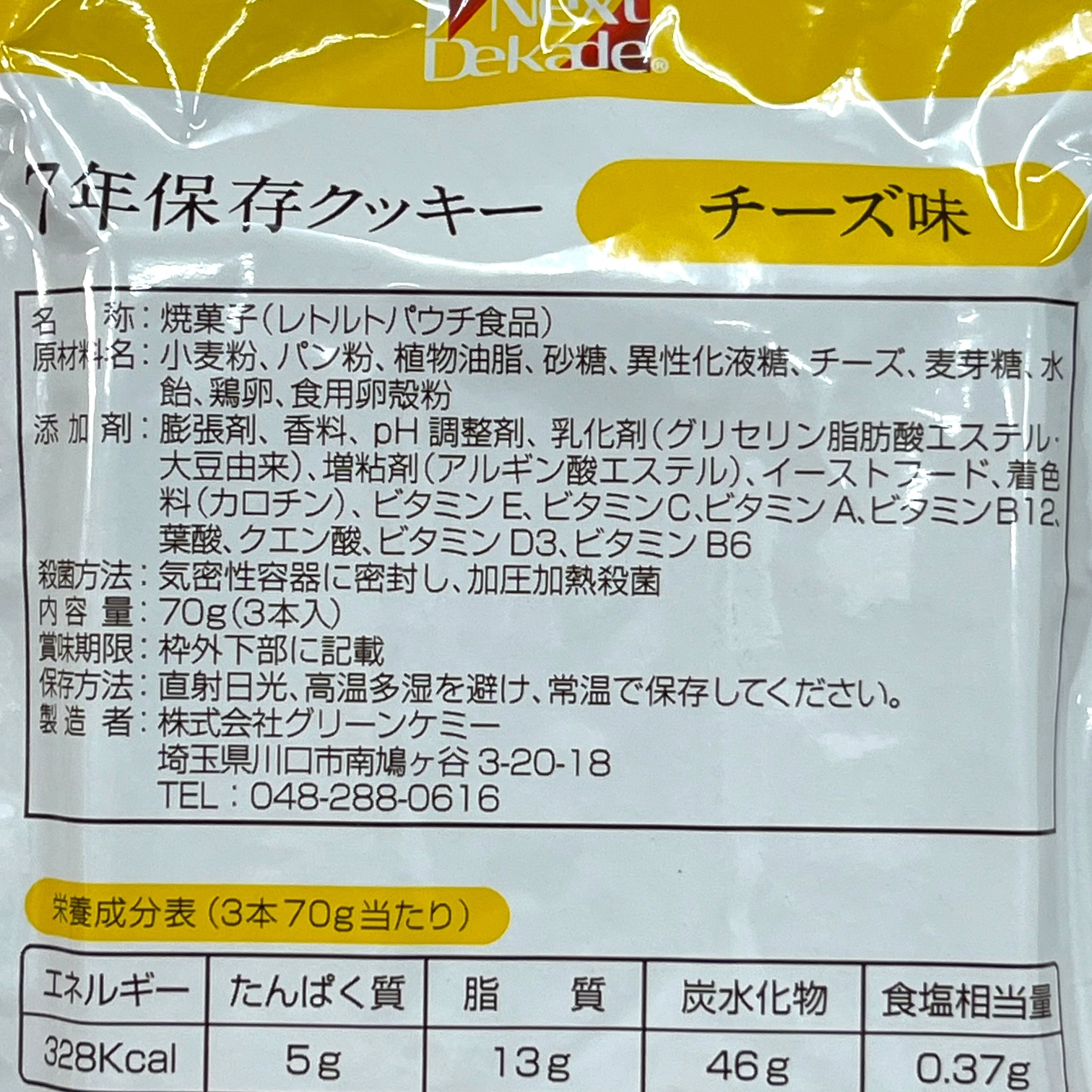 7年保存のクッキーです。加圧加熱殺菌のレトルトパウチタイプ。1袋に3本クッキーが入っています。耐温度域が-20℃~80℃と温度変化に強く、防災備蓄にも安心です。チーズ味は、マイルドなやさしい味わいです。