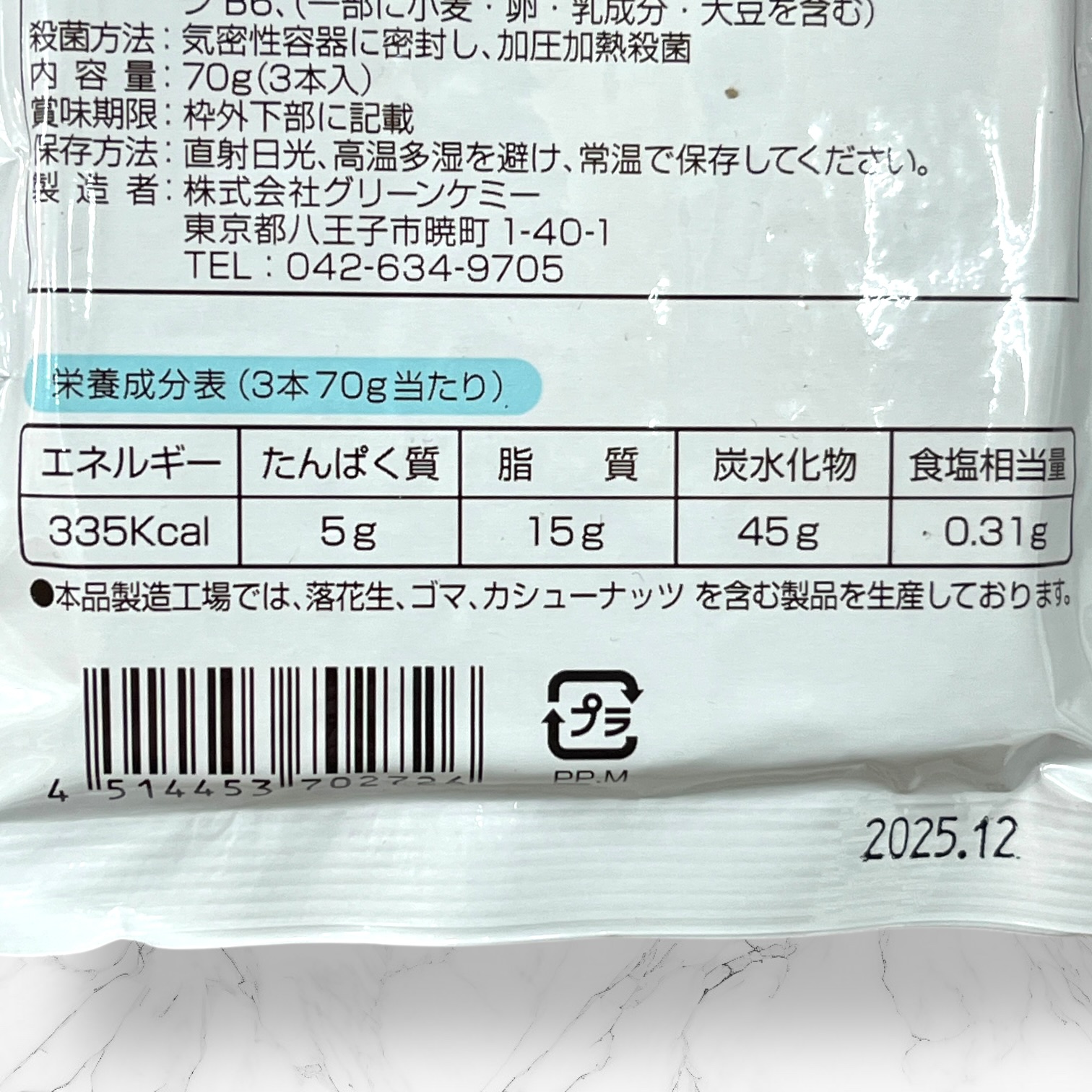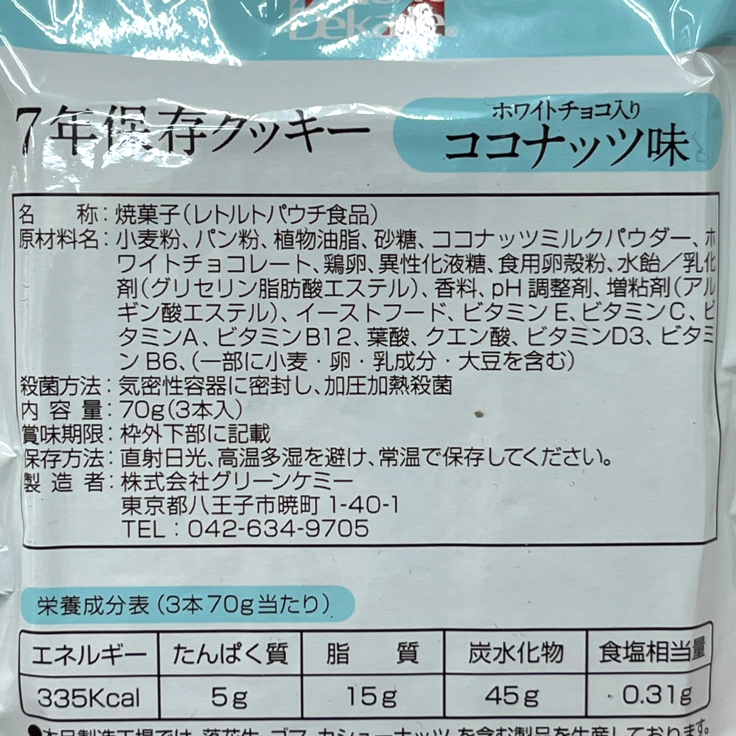 7年保存のクッキーです。加圧加熱殺菌のレトルトパウチタイプ。1袋に3本クッキーが入っています。耐温度域が-20℃~80℃と温度変化に強く、防災備蓄にも安心です。ホワイトチョコ入ココナッツ味はココナッツとホワイトチョコの甘みがマッチした美味しいクッキーです。