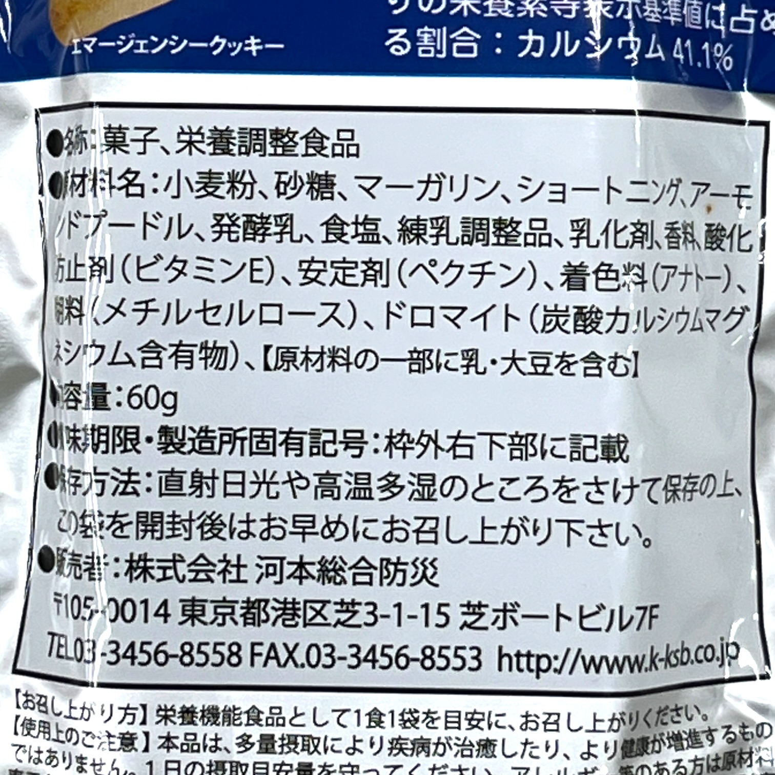 7年保存可能なエマージェンシークッキー。サクサク食感で美味しく、ハイカロリー&カルシウム配合の栄養機能食品。シンプルな味わいのプレーン味です。