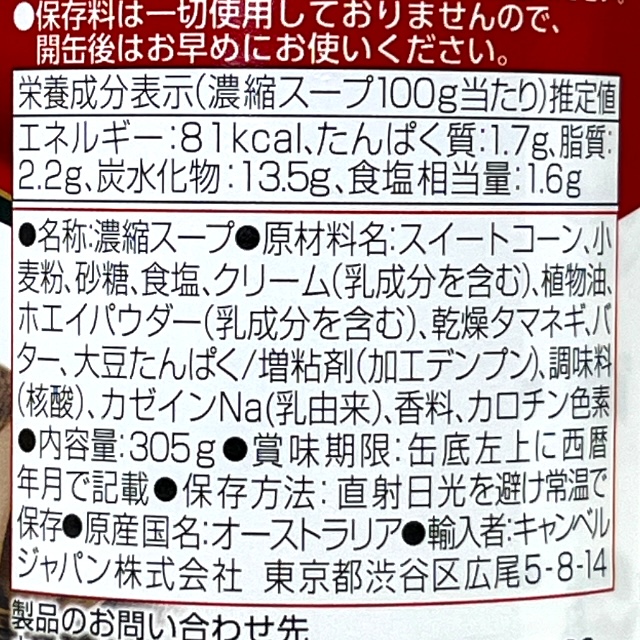 クリーミーなコーンポタージュに粒々のスーパースイートコーンがたっぷり入ったおいしいスープです。2倍濃縮なのでスプーンなどで中身を鍋に開け、空き缶1杯分(300ml、お好みで調節)の牛乳を徐々に加えながら中火でゆっくりとかきまぜて温めればできあがり。最後に泡立て器でよくまぜる事が美味しさの秘訣です。スープはもちろん、グラタンやキッシュのソースに混ぜても美味しい!1缶で約3人前です。