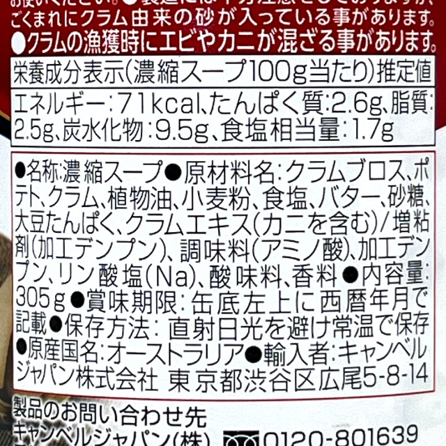 新鮮なクラムとじゃがいもがいっぱいの海の香り豊かな本格派の味。魚介類をさらに加えて、いろいろなシーフードチャウダーが楽しめます。2倍濃縮なのでスプーンなどで中身を鍋に開け、空き缶1杯分(300ml、お好みで調節)の牛乳を徐々に加えながら中火でゆっくりとかきまぜて温めればできあがり。スープはもちろん、シーフードドリアのソースにしたり、シチューに混ぜても美味しい!1缶で約3人前です。