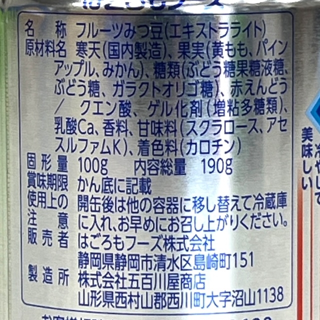 寒天、黄桃、パインアップル、みかん、えんどう豆が入っています。 ガラクトオリゴ糖入り。フルーツのおいしさを引き立てるちょうど良い甘さのシラップ。